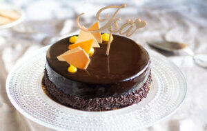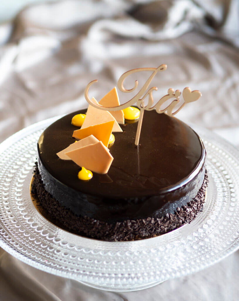Kakussa maistuvat täyteläisen kermainen kinuski-juustokakkumousse, ihana kultasuklaatäyte piparicrumblella sekä raikas passiontäyte. Kakku on kuorrutettu kauniin kiiltävällä suklaakuorrutteella, koristeltu kultasuklaalastuilla ja passiontäytteellä. Viimeisen silauksen kakkuun tuo ripaus kullan kimalletta. Kakun pohjana herkullinen piparikeksipohja.