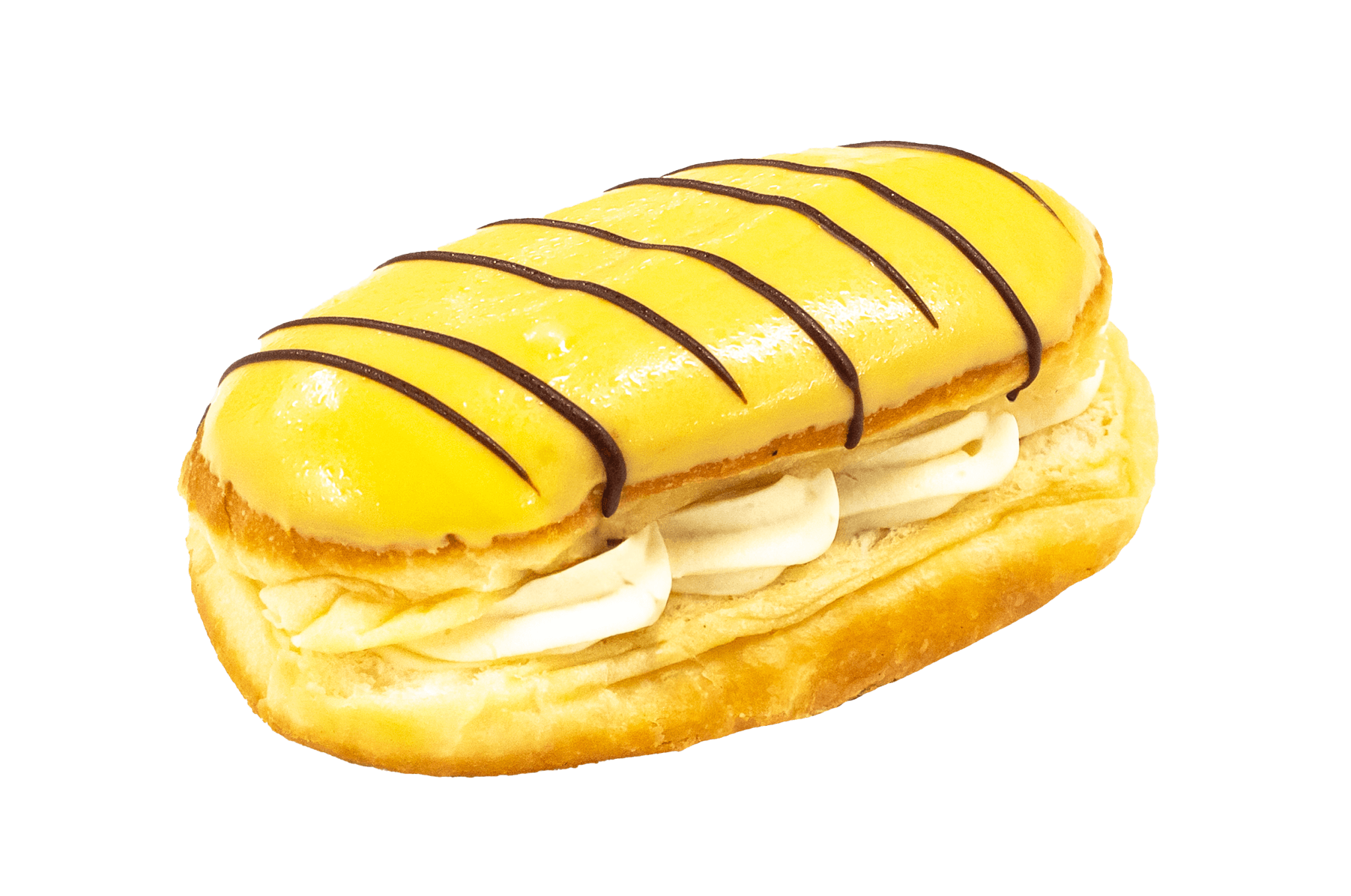 Suussa sulavan herkullisessa, kotimaisessa Banaanimunkissa on ihana banaanikermatäyte, ja se on kuorrutettu banaaninmakuisella, kauniin keltaisella kuorrutteella sekä koristeltu tryffeliraidoilla. Munkki on herkullisen pehmeä ja maukas.