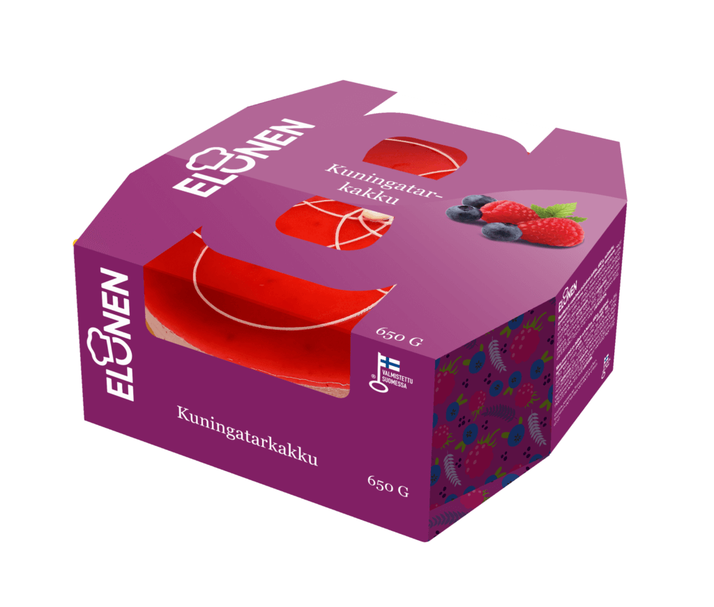 Elosen Kuningatarkakku on suussa sulavan herkullinen kakku, jonka vaalean kakkupohjan päällä ja pirteän vadelmaisen moussentäytteen alla on ihanaa mustikkahilloa. Päällä herkullinen vadelmainen kiille ja kaunis kukkakoristelu.