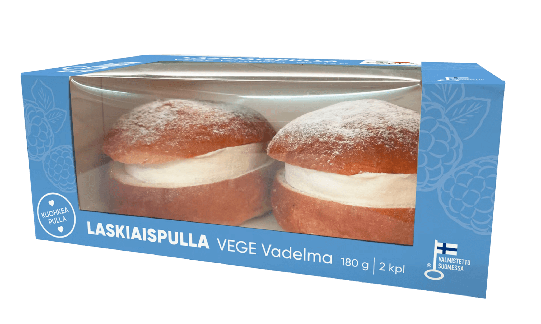 VEHNÄJAUHO, kauravispivaahto (vesi, kovetettu kasviöljy (kookos, rypsi), sokeri, KAURAUUTE, emulgointiaineet (E475, E435), stabilointiaineet (E464), happamuudensäätöaine (E331), suola, väri (E160a), aromi (vanilliini)), vadelmatäyte (16%) (sokeri, vadelma, vesi, muunnettu perunatärkkelys, sakeuttamisaine (E440), happamuudensäätöaineet (E330, E333), säilöntäaine (E202)), sokeri, vesi, kasvirasva (rypsi, sg-palmu), emulgointiaineet (E481, E471), hiiva, herneproteiini, jodioitu suola, kardemumma ja maissitärkkelys.