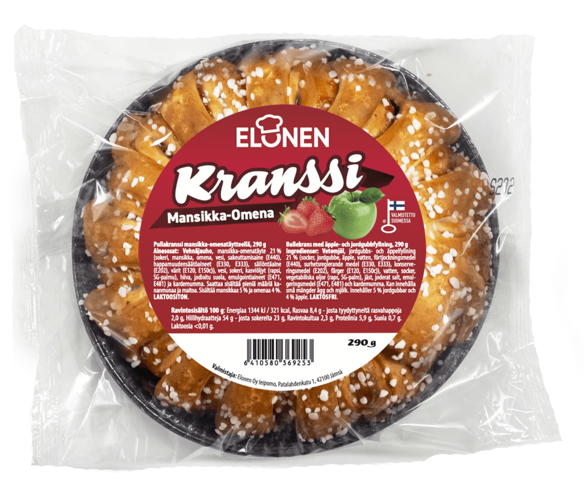 VEHNÄJAUHO, mansikka-omenatäyte 21% (sokeri, mansikka, omena, vesi, sakeuttamisaine (E440), happamuudensäätöaineet (E330, E333), säilöntäaine (E202), värit (E120, E150c)), vesi, sokeri, kasviöljyt (rapsi, SG-palmu), hiiva, jodioitu suola, emulgointiaineet (E471, E481) ja kardemumma.