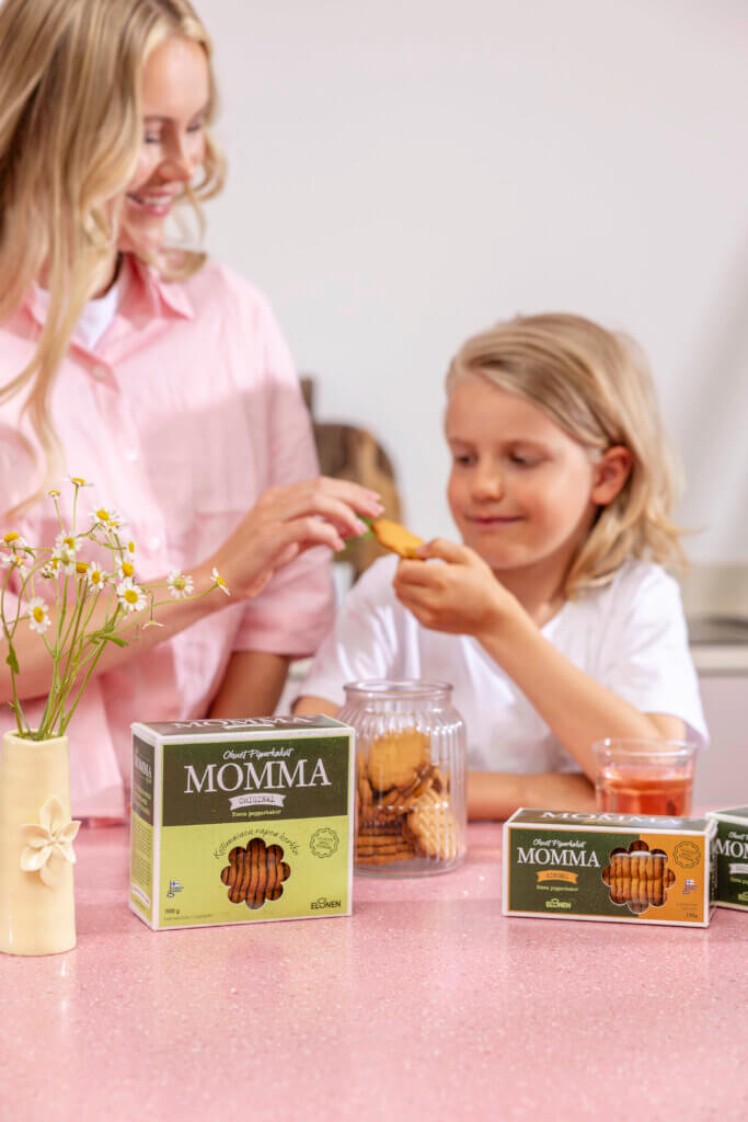 Momman Kardemumma piparkakut ovat ohuita ja rapeita kotimaisia herkkuja! Kardemumman makuinen piparkakku sopii täydellisesti joulun herkutteluhetkiin. Momma maistuu perinteisesti kahvin, teen ja glögin kaverina sekä jouluisissa jälkiruuissa. Momma piparkakut leivotaan Elosen perheleipomossa, Rantatöysässä.