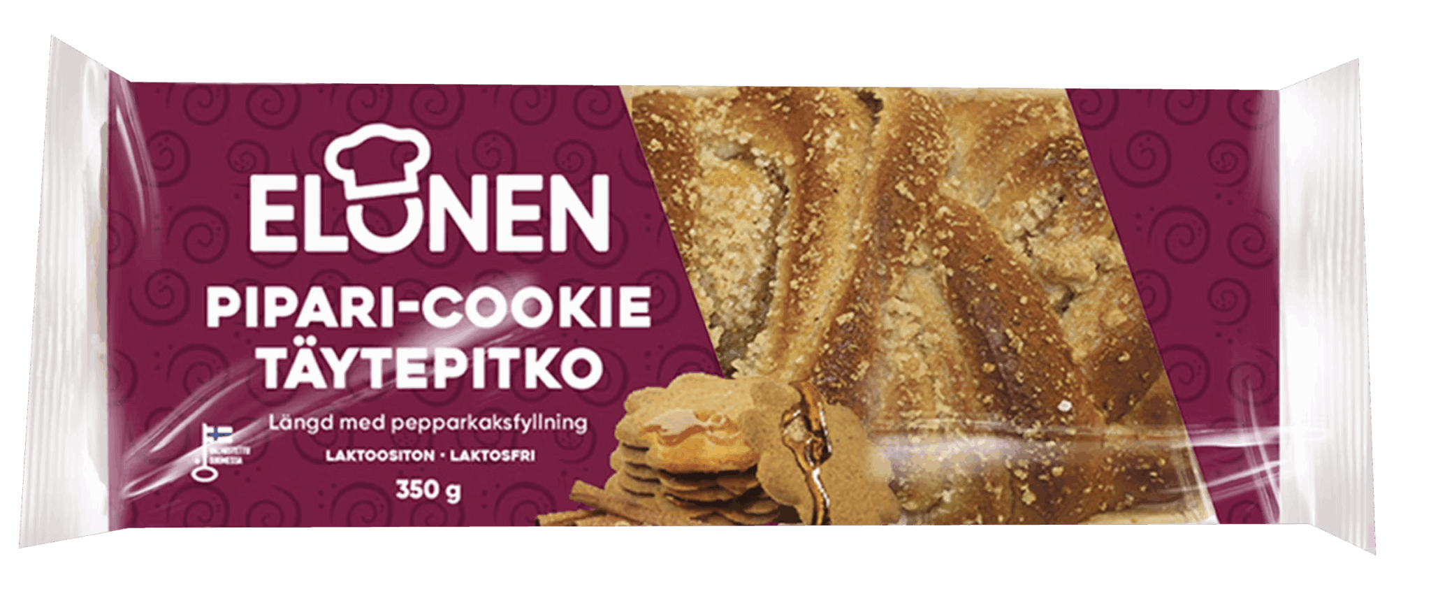 Suussa sulavan herkullinen täytepitko, jonka sisälle kätkeytyy mehevä piparitäyte. Pitkon pintaa koristaa rapea cookierouhe.