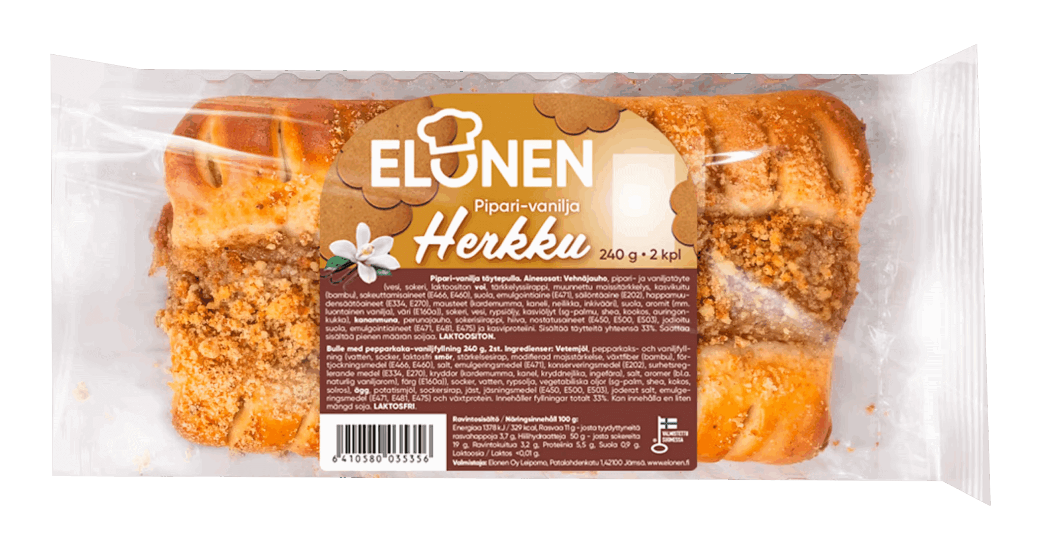 VEHNÄJAUHO, pipari- ja vaniljatäyte (vesi, sokeri, laktoositon VOI, tärkkelyssiirappi, muunnettu maissitärkkelys, kasvikuitu (bambu), sakeuttamisaineet (E466, E460), suola, emulgointiaine (E471), säilöntäaine (E202), happamuudensäätöaineet (E334, E270), mausteet (kardemumma, kaneli, neilikka, inkivääri), suola, aromit (mm. luontainen vanilja), väri (E160a)), sokeri, vesi, rypsiöljy, kasviöljyt (sg-palmu, shea, kookos, auringonkukka), KANANMUNA, perunajauho, sokerisiirappi, hiiva, nostatusaineet (E450, E500, E503), jodioitu suola, emulgointiaineet (E471, E481, E475) ja kasviproteiini. Sisältää täytteitä yhteensä 33%.
