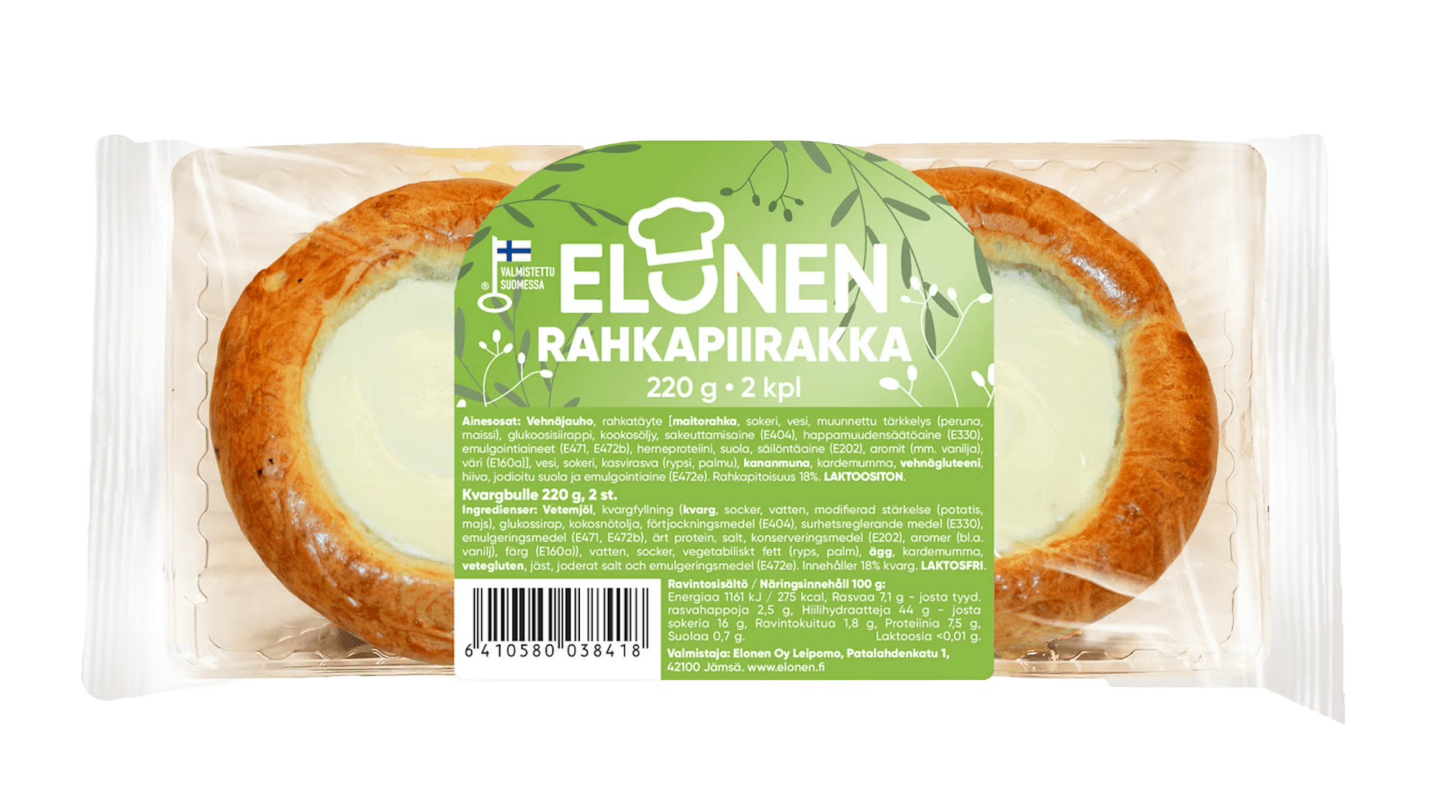 Kotimainen Rahkapiirakka, jossa on perinteinen pullapohja ja runsaasti suussa sulavaa, herkullista rahkatäytettä. Rahkapiirakka on Elosen klassikkotuote!