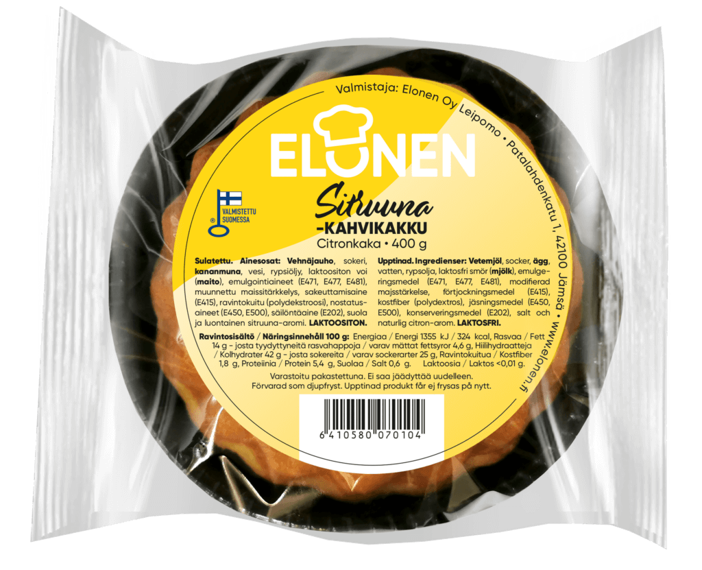Vehnäjauho, sokeri, kananmuna, vesi, rypsiöljy, laktoositon voi (maito), emulgointiaineet (E471, E477, E481), muunnettu maissitärkkelys, sakeuttamisaine (E415), ravintokuitu (polydekstroosi), nostatusaineet (E450, E500), säilöntäaine (E202), suola ja luontainen sitruuna-aromi.